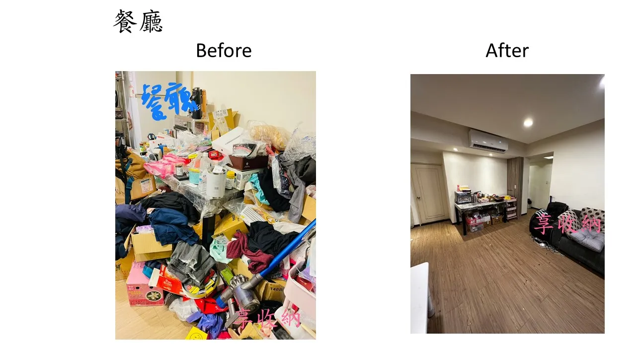 4. 餐廳部份則是依委託人全家生活習慣而將常用的生活用品放餐桌上,而餐桌下方則放較常用的生活備品