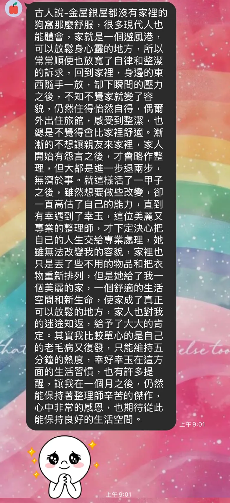 早上出門工作前收到客戶傳來的回饋,超級無敵感動。這是身爲整理師最大的支持🥰